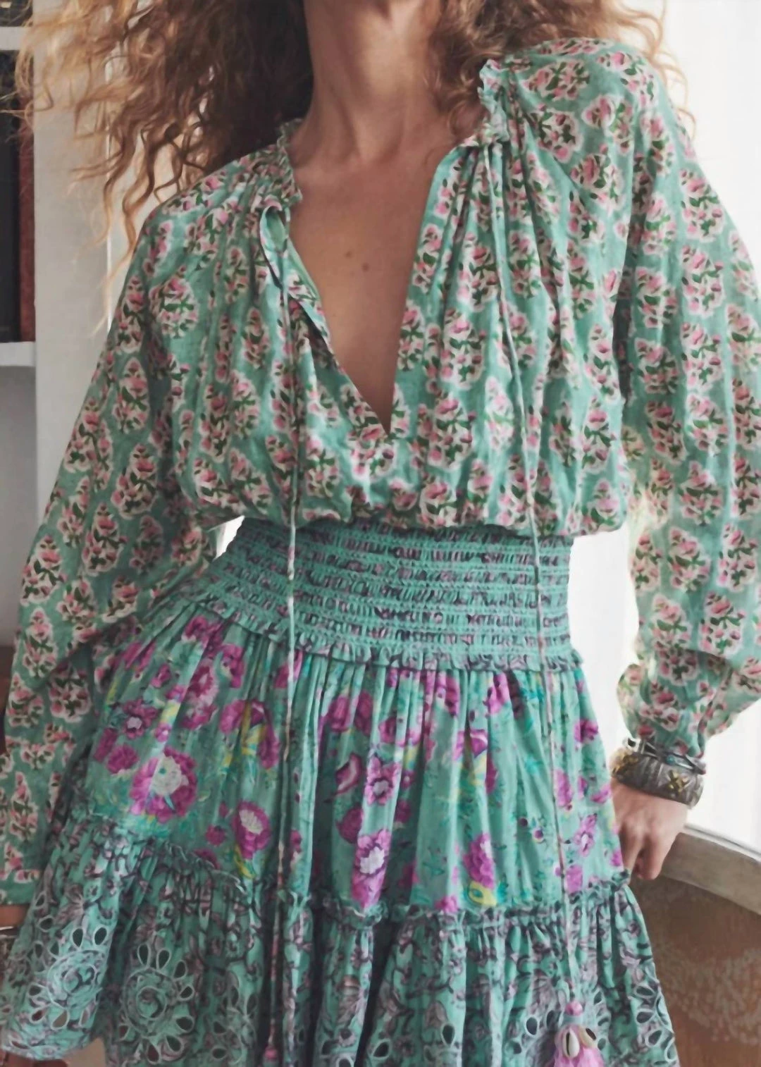 V neck with hidden hook-and-eye closure at front. Long sleeves with covered elastic cuffs. Tie closure and button closure and keyhole at back. Covered elastic at waist