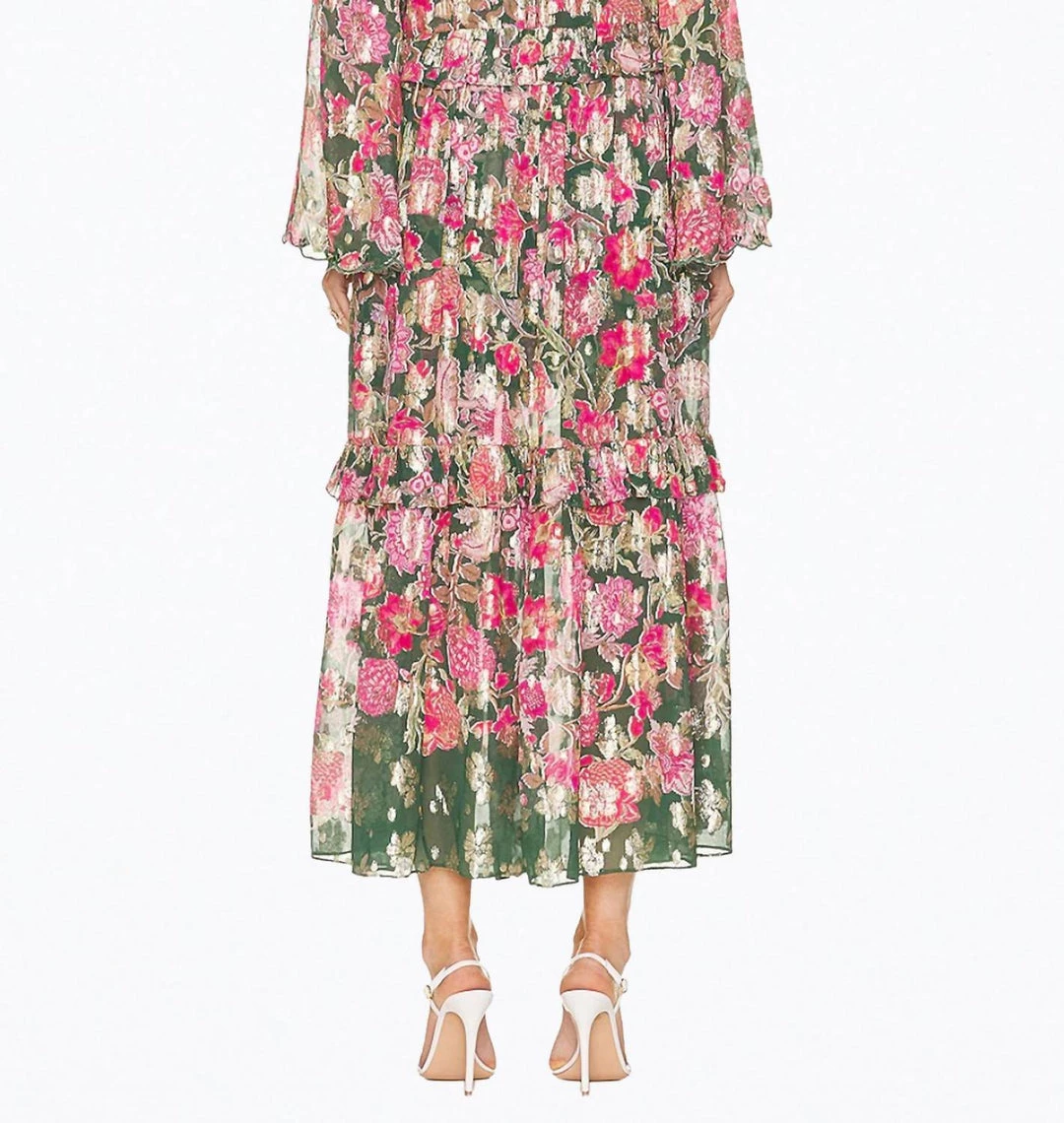 Full of feminine detail,οΏ½οΏ½Hemant and Nandita’s ‘Sabi’ kaftan is made from lightweight georgette chiffon infused with silver and gold metallic florals and has pretty ruffles throughout.οΏ½οΏ½ItοΏ½οΏ½has a thigh-high slit and it detailed with a drawstring – you can use it to cinch your waist or tie loosely for a relaxed fit. Remove the optional slip to use it as a swim cover-up for beach vacations.οΏ½οΏ½Color – Pine GreenFabrication – 80% Viscose, 20% LurexCare – Dry cleanStandard Clothing Sizing